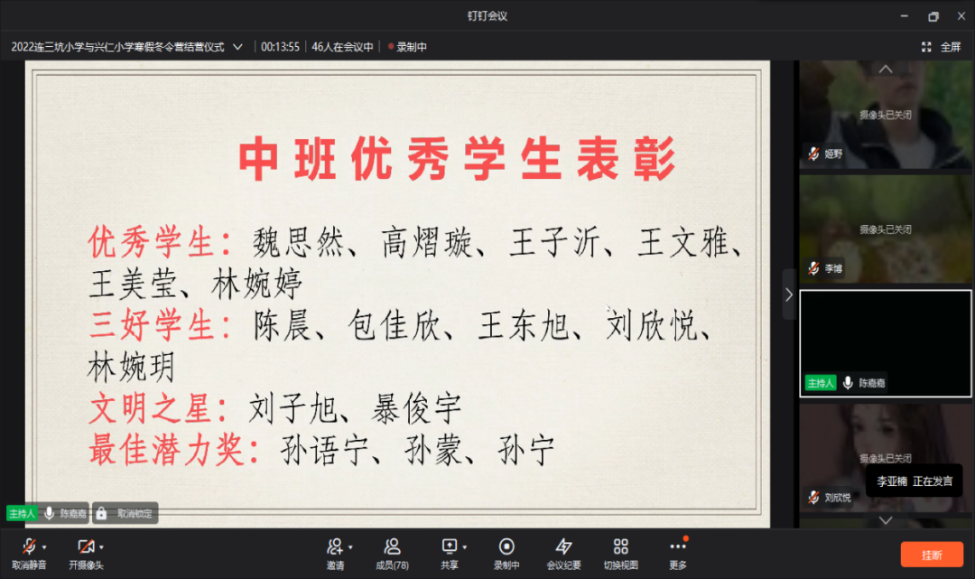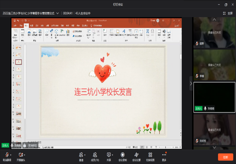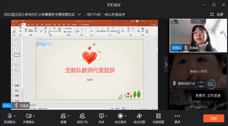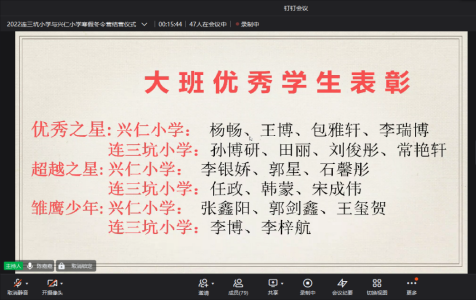 高校长真切发言道,历时14天的活动已经圆满结束,代表连三坑小学全体学生向支教老师表示感谢,通过此次线上丰富多彩的课程,学生也收获颇多,并表扬认真学习的学生们。最后对益行和支教的大学生们表示衷心的感谢,也祝愿师生间的友谊会化成每个人向上的动力,激励孩子们树远大志向,成栋梁之才和社会主义接班人。