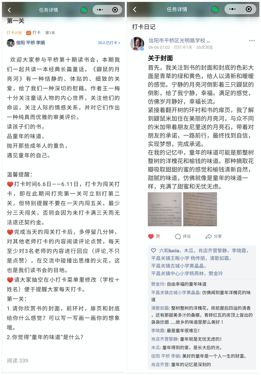 平桥第十期教师读书会于2021年5月31日- 6月 11日开展,5月31日-6月6日为自由阅读阶段,6月7日-6月11日进行线上打卡。老师们共读儿童文学书籍《鼹鼠的月亮河》,这本书有一种恬静的、体贴的、细致的关爱,给人一种深切的慰藉。读书会由平桥光明路学校李娟老师为主带老师,以线上闯关打卡的方式进行,老师每闯一关即会解锁下一关,共闯五关来进行阅读的分享和交流,共有20名教师报名参与,实际有20位教师完成全部打卡内容。阅读完《鼹鼠的月亮河》后,很多老师利用导读课和交流课把这本温情的书籍带给了班级学生,这也是教师读书会的目的,让老师爱上阅读的同时把更多优质的童书带给学生。