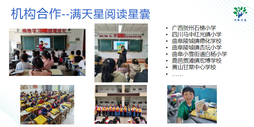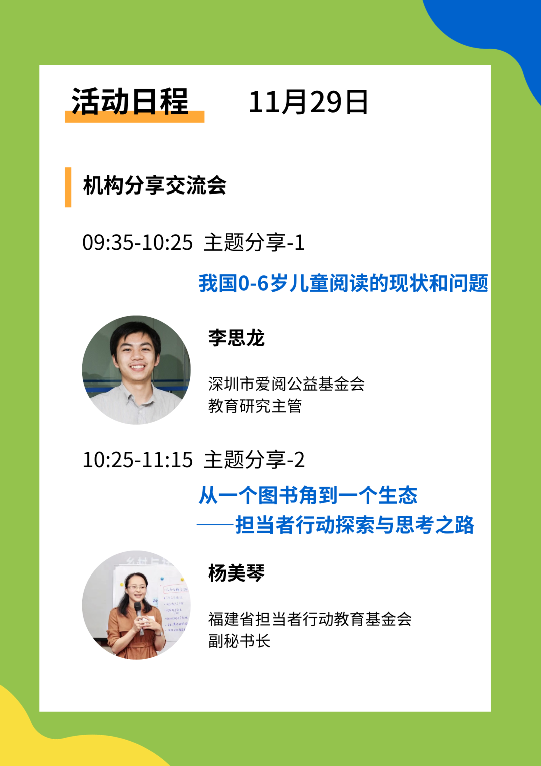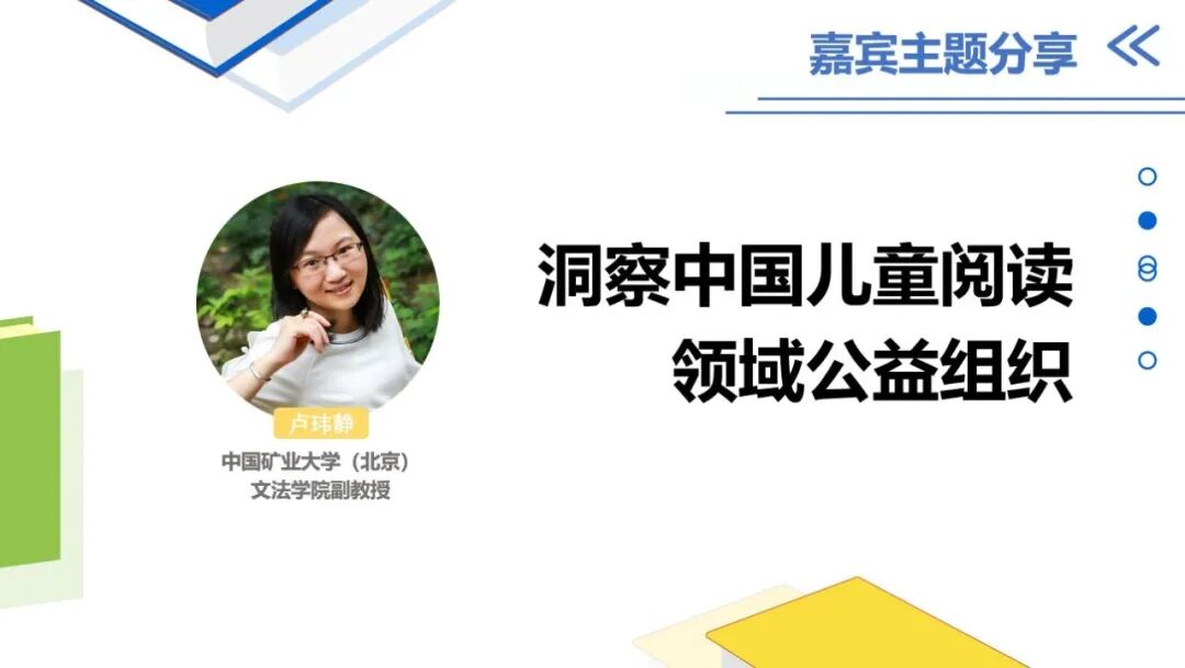 当然多元生态也会产生有质量参差不齐的公益项目,要如何鉴别阅读公益组织的专业性,是一个难点。 对此,卢教授以乡村学校图书角为例,介绍了鉴别时要注意的一级节点和二级节点问题,让递送图书→孩子阅读图书→阅读效果实现这样的因果链条更流畅,实现项目成效。爱阅童书100项目负责人袁泉分享了爱阅公益的几个重点项目,无论是资助型项目还是运作型项目都围绕着解决“为什么要儿童阅读”(观念) “阅读读什么”(图书) “儿童阅读怎么读”(方法)这三个问题运作的。 为联结各方力量推动早期阅读的普及和发展,探索高效的早期阅读干预模式,爱阅公益研发了阅芽包、阅芽图书馆、线上阅读小程序;为配备优质、适宜的童书开发了爱阅公益书目项目,持续十年研制发布,有准确丰富的新书数据,专业科学的书单结构,通读全书的专家评选,严谨的评选机制,全心全力做好儿童阅读的合格守门人;为更好支持公益组织开展阅读类公益项目和阅读类公益机构的探索与发展,给0-12岁乡村儿童和流动儿童提供优质的阅读服务和更多解决问题的方案,开启了阅林计划。 爱阅公益一直在推动高品质儿童阅读发展的路上深耕,专业且用心,也希望找到同盟者,彼此携手,为孩子更美好的未来。 “要把阅读这件事情做好,做深入,必然会由阅读活动上升到做阅读课程。尤其要长期化、有规划地去做的,不止于热闹,它必然会出现阅读课程化的需求,于是橡果书院诞生了。”担当者行动教育基金会副秘书长杨美琴在本次分享中着重从缘起、定位、项目模式三方面介绍了橡果书院。 这是担当者以阅读教育为切入点,基于教师发展与学习规律,建立的一个系统、持续的主要服务乡村教师的公益性质与专业性质并重的在线阅读学习平台——通过赋能教师的成长,让阅读教育落地生根,帮助孩子爱上阅读,助力乡村儿童基础教育阶段的学习力、生命成长和人格发展。 橡果书院是一个“成长共同体”,本着生命影响生命的价值逻辑,将全国各地的教师尤其是乡村教师联结在一起,共读、共写、共生活;让教师在教育教学工作中真实获得归属感、价值感、成就感和幸福感。活力未来亲子园机构项目主管温素妍向我们介绍了一直致力于让更多流动、留守儿童及其家庭,享有持续获得早期亲子教育的机会的活力未来亲子园机构——机构面向0-3岁儿童和家长开放的安全适宜的空间,提供各类符合儿童发展特征的玩具、绘本。 孩子和家长可以在亲子园里自由探索、运动、游戏、阅读、认识朋友、快乐交流开展的所有活动内容都以儿童为中心,同时也将阅读融合在亲子园的项目活动中。 项目不仅仅是直接提供儿童早期亲子教育服务,更为核心的是建立起这些家庭的早教支持体系、改变家长的育儿理念和行为,注重赋能家长,鼓励家长深度参与项目,从受益人成长为亲子服务老师。不仅帮助受益家长适应当地社区并用技能融入社会,可持续为项目提供师资最终为儿童形成持续且长期的影响干预。帮助受益家庭建构共同体和社群,精准帮扶弱势群体家庭形成互助和经验交流网络,支持改善社区整体教育和人文环境。满天星公益的阅读研究与推广中心高级经理李程分享了满天星公益在行业支持路上的探索与实践,从阅读资源支持类的项目、伙伴成长支持、和行业基础设施建设三个方面,系统介绍了满天星公益项目。 并在探索行业的合作中,优先在阅读资源板块与行业伙伴合作。满天星公益将提供包括项目配套资源包、多样的合作方式、一定的项目运营经费支持、项目经验输出及培训支持、社群互助交流、免费开放借阅系统等。愿在阅读行业发展路上寻到更广阔的合作平台,觅到给力的同行者。「阅享悦读」项目负责人Lynn以四家乡野图书馆的搭建为案例,介绍了「阅享悦读」项目是如何做好在地共建和赋能计划,支持乡村教育,助力儿童成长,赋能志愿者,发展乡野多媒体图书馆。“这不仅仅是一个提供阅读的场所,我们真正想做的是将知识和学习的技能教给每一个孩子,丰富在地儿童的学习体验,让他们受益终身”。广州全思信息科技有限公司负责人邵建彰以阅读马拉松小程序、因爱朗读、阅读资源网等优秀案例向大家展现互联网科技通过提供阅读公益数字化定制服务助力公益,为公益项目创造更大成效。 沃岭公益负责人从合作伙伴的视角向我们分享了与担当者行动和满天星公益机构合作感受。 她提到:“去中心化的机构合作,得到更多支持,向更多有阅读需求的地方开放基础服务,降低区域阅读难度”。 爱阅公益教育研究主管李思龙开头从科学界和教育界的角度介绍了对阅读的认识,强调阅读从儿童出生就开始的重要性。 同时也指出目前我国儿童早期阅读的问题:缺乏从出生就开始阅读的观念;缺乏早期阅读读物,缺乏共读的频率和时间;以及在特殊儿童方面,缺乏支持残障儿童开展早期阅读的图书和指导。 “儿童早期阅读是一项社会系统工程,关系到新一代人的能力发展,是整个社会的责任,需要家庭、医疗保健机构、教育部门、公共图书馆和社会工作等方方面面的协调与合作。”针对所指出的问题,李思龙老师对此也分享了国内外在政策倡导、幼儿园、图书馆、社会组织等优秀经验。担当者行动教育基金会副秘书长杨美琴分享了担当者行动近二十年来的探索与思考,在推行过程中的实
