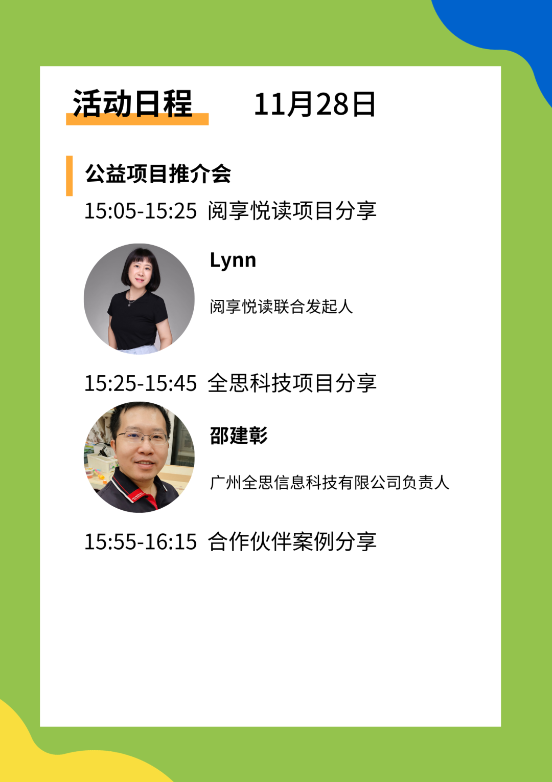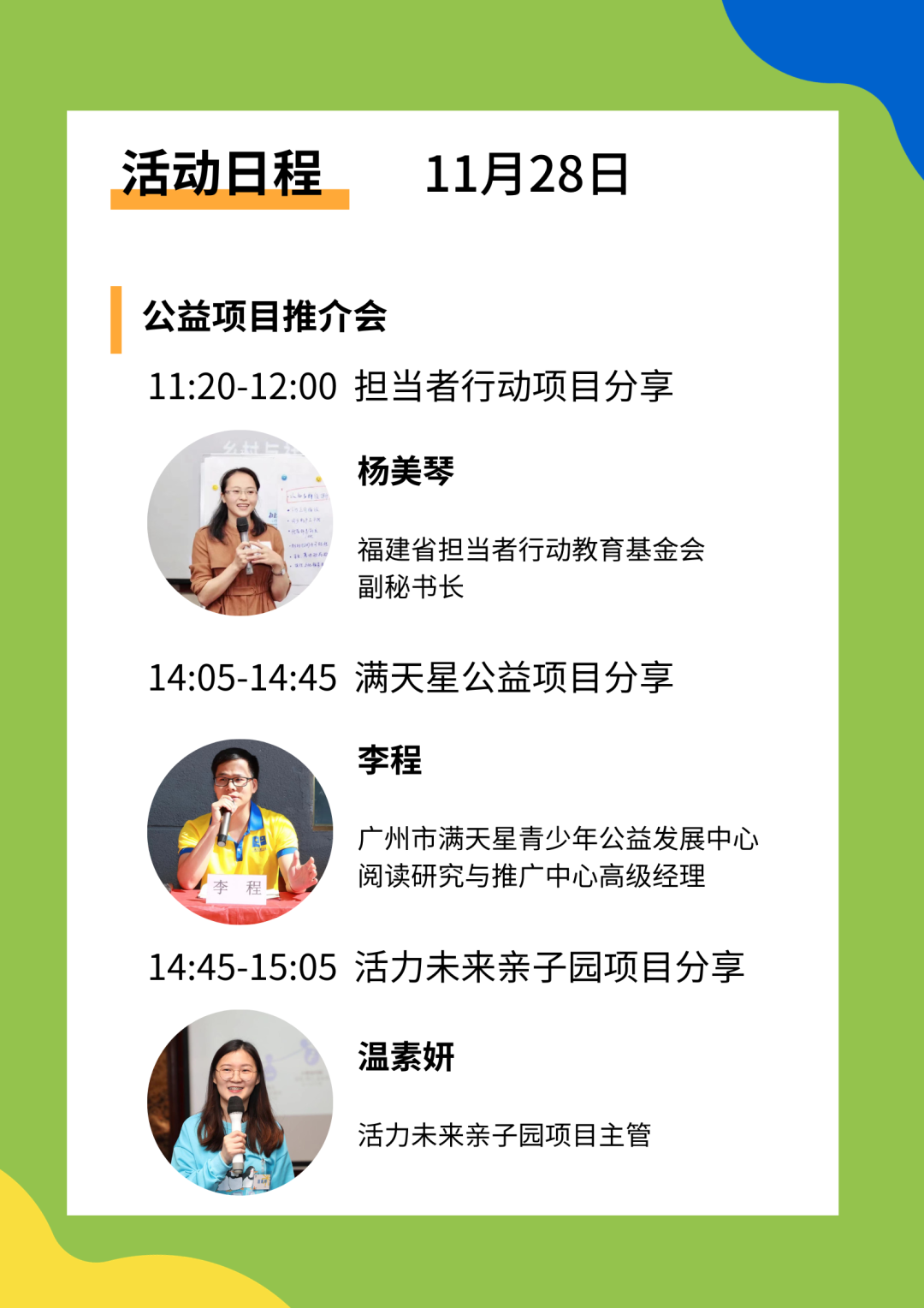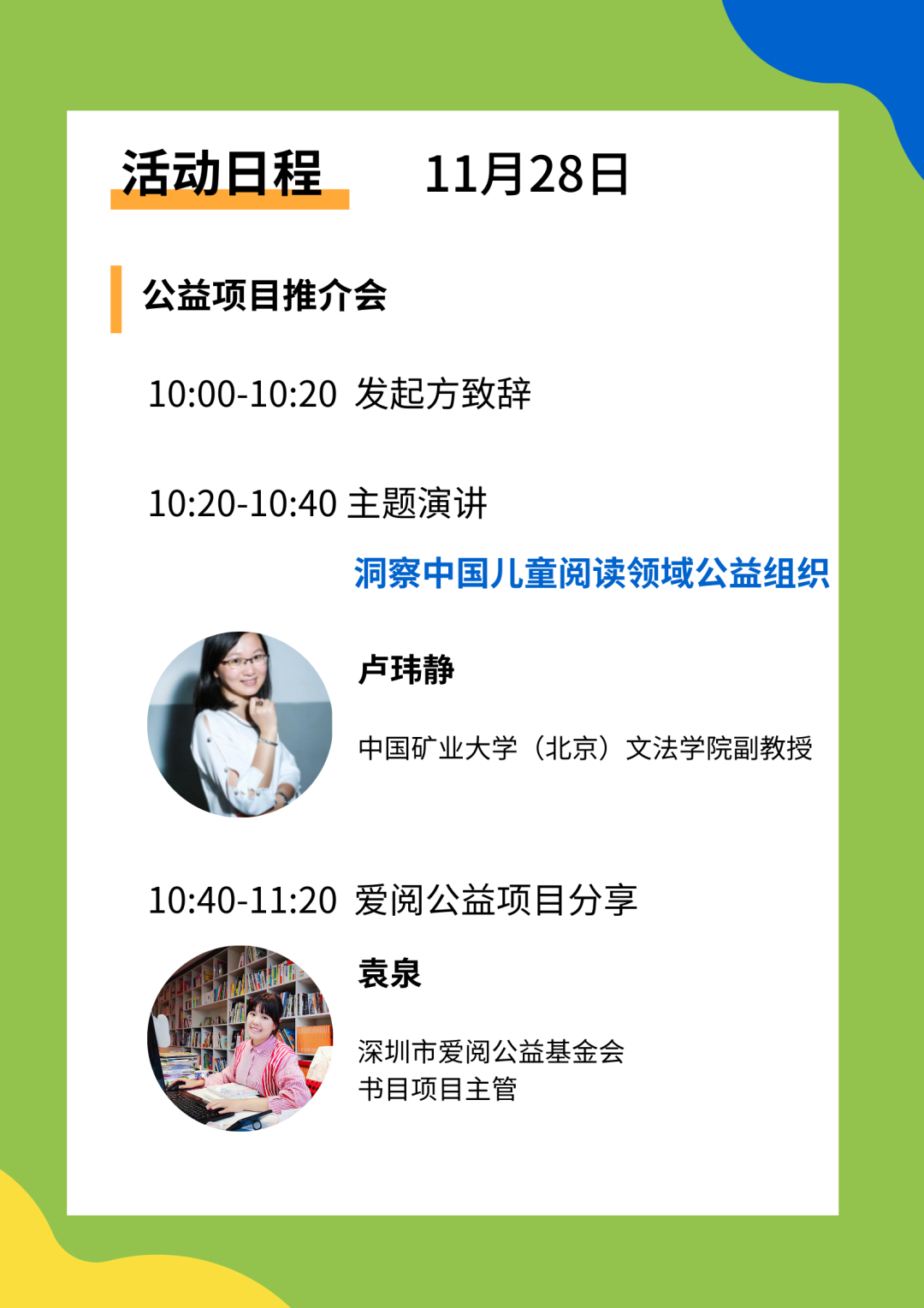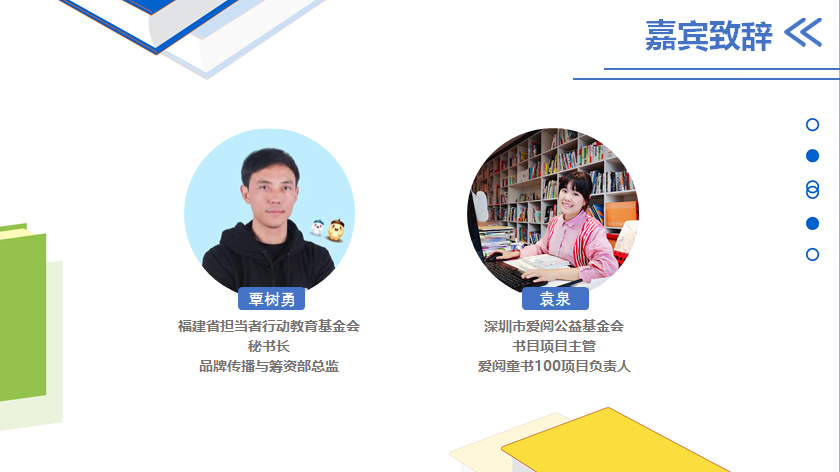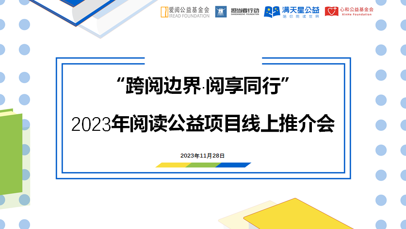 2023年11月28-29日,以“跨阅边界·阅享同行”为主题的2023年阅读公益项目推介会在云端与大家相聚。为期两日的推介会由深圳市爱阅公益基金会、福建省担当者行动教育基金会以及满天星公益联合发起,心和公益基金会给予支持,在微信视频号的直播合计超10000人次在线观看。 第一天的“项目推介”以“看见”为关键词,卢玮静老师洞察中国儿童阅读领域公益组织的主题分享,作为“整体”的行业发展呈现,与六家公益机构作为“部分”的项目推介展示相结合,更好地链接各方; 第二天则以“分享”为导向,邀请爱阅公益基金会、担当者以及满天星公益三位主办方围绕政策倡导、项目设计、筹款产品设计三个主题做深入的分享和交流,展现公益机构在阅读领域的行动与思考。 左右滑动查看活动日程