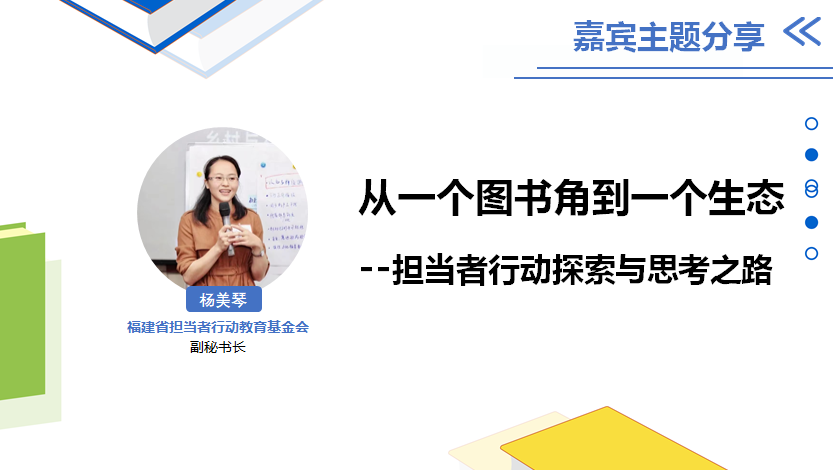 福建省担当者行动教育基金会秘书长覃树勇为推介会做开场致辞,他围绕着“跨阅边界·阅享同行”主题,分享了自己的看法,“当我们深入一线、深度运作时,才看到把阅读做好不是一件容易的事情,这其中存在不少的边界:图书、时间、空间、观念、认知、校内校外、家庭、学校和公益机构之间、公益机构和公益机构之间等等。而我们要做的其中一件事就是打破和跨越这些约束边界,从各自做项目到联合起来一起服务人,心里有孩子和老师,营造良好生态。”