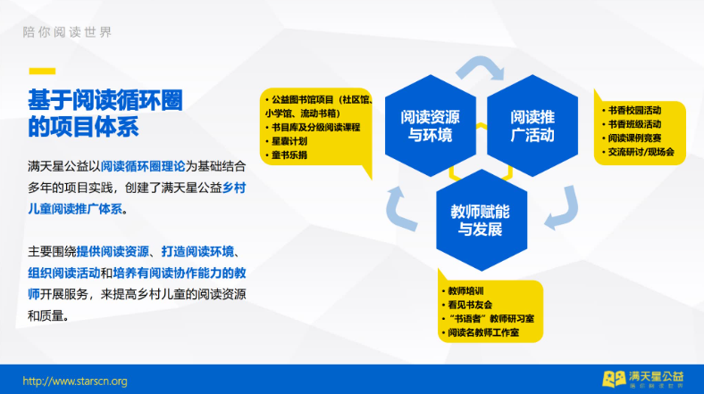 满天星公益是一家专注于乡村儿童阅读推广的教育类公益机构,机构使命是提高乡村儿童的阅读品质。为实现这一使命,满天星公益以阅读循环圈理论为基础结合多年的项目实践,创建了满天星公益乡村儿童阅读推广体系,体系主要围绕提供阅读资源、打造阅读环境、组织阅读活动和培养有阅读协作能力的教师开展服务。