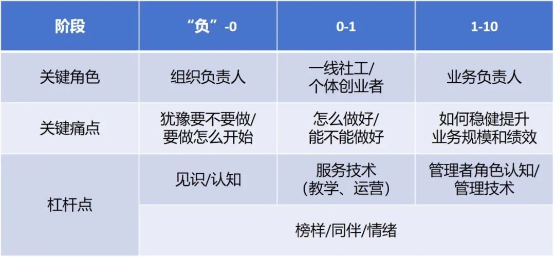 基于心萌计划1-2期的实践与迭代,我们总结了针对不同发展阶段的关键角色及其痛点,并识别出了能帮助他们突破的杠杆点。通过这些分析,我们为3期的支持提供了更有针对性和精准的方向。