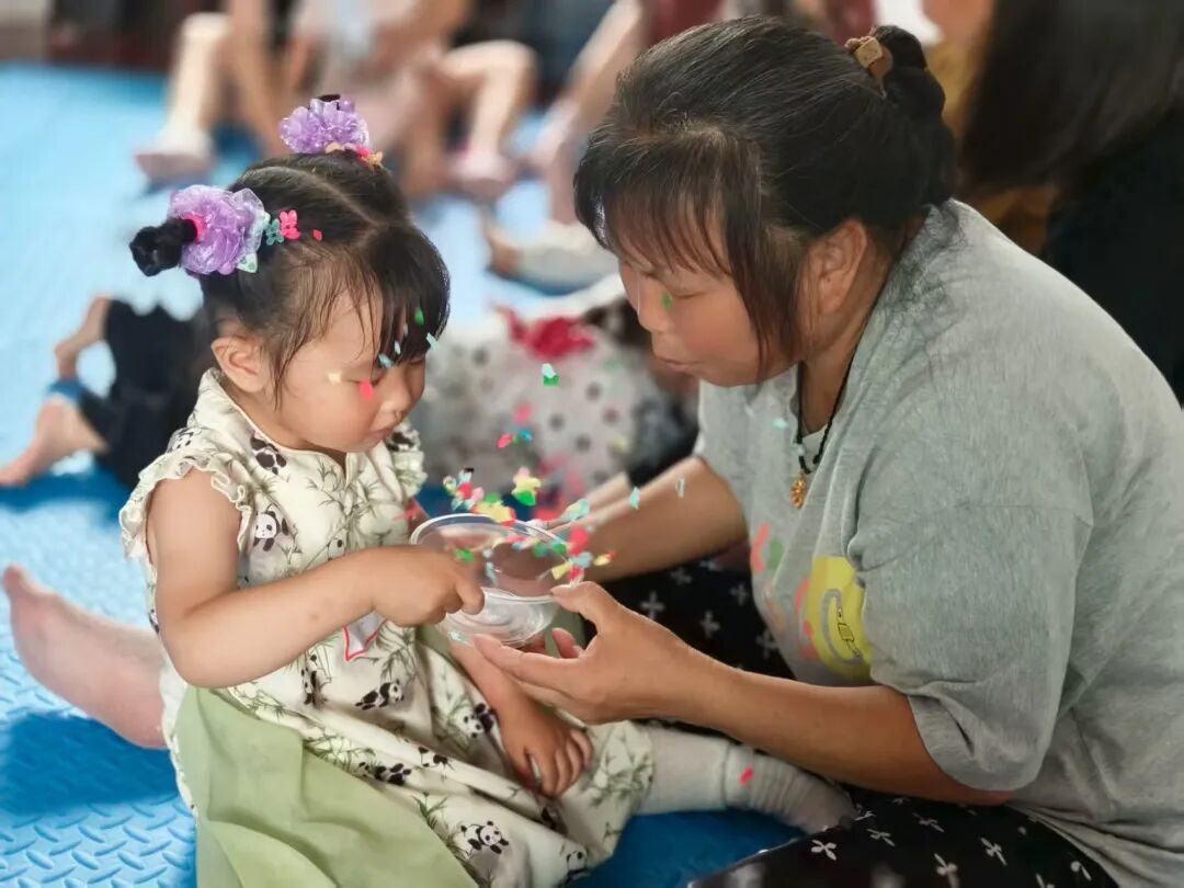 亲子课上的音乐,游戏也成为了孩子和家长日常生活中的内容:豪豪爸爸把《合拢张开》舞蹈改编成睡前互动仪式,依伊家用“毛毛虫爬呀爬”儿歌化解刷牙抗拒。优优奶奶用童谣教孙女辨认蔬菜。洪江岩垅垅乡的年轻父亲第一次知道:"逗娃笑也是早教!"现在他每天下班陪孩子玩举高高游戏。刘奶奶戒了麻将,学会用童谣给孩子洗澡;靖州的爷爷开始主动询问:"下节课教啥?我先提前看看。"