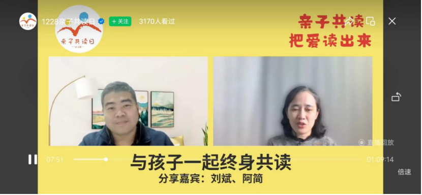 12月28日20:00-21:00,刘斌和阿简完成了“与孩子一起终身共读”的主题直播。在直播中,再次强调“亲子共读”在亲子关系、儿童终身成长的重要意义,在认同0-6岁亲子共读的重要价值之后,长时段聚焦在6-18岁亲子共读的价值和方法。在价值层面,阿简从个人思维和幸福感以及保持高质量的亲子关系、为孩子建设更好的社会来展开。在方法层面,阿简的主要建议是“热情”“兴趣”“及时”三个词:即知行合一地真实展现出自己的阅读热情,阅读内容完全从孩子的兴趣展开,及时地支持孩子以阅读探索世界。大量阅读去满足好奇心、培养洞察力等(本次直播超2000人观看)。